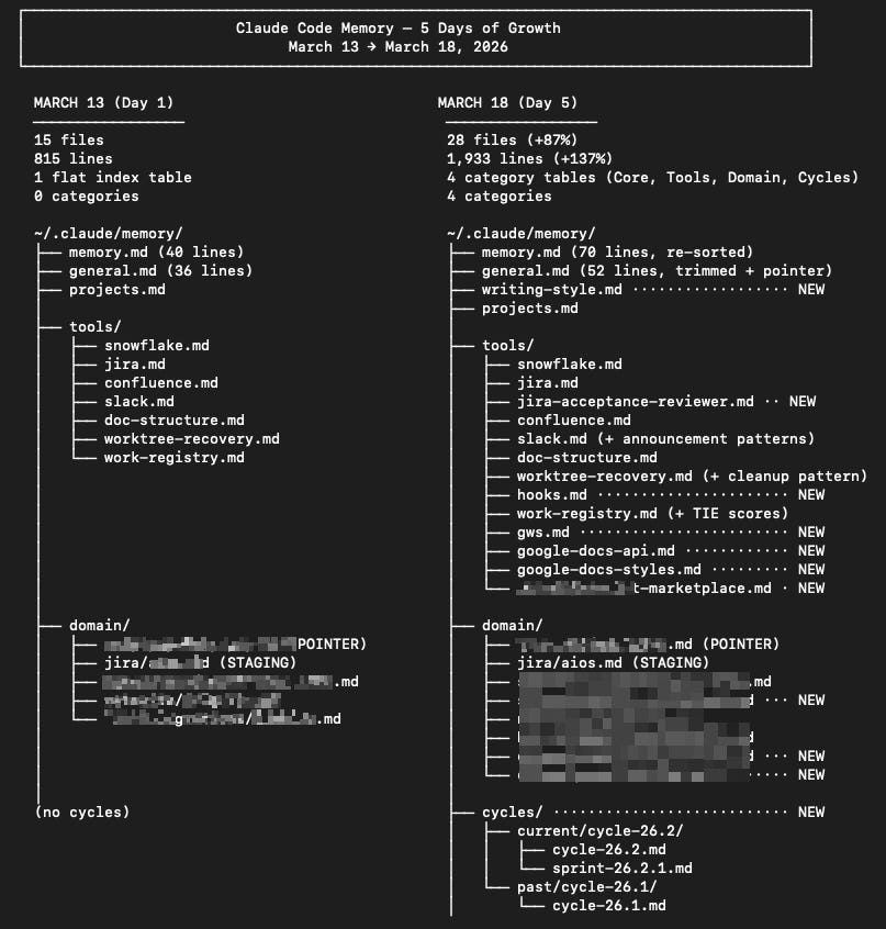 ~/.claude/CLAUDE.md went from 189 lines to 63 lines. Seven new files in ~/.claude/memory/ covering tools and domain knowledge that had previously been crammed inline. Three new files in project memory for the repo I’m currently working in. A pointer entry for a product I work on. An auto-init instruction so every new project gets the structure from day one.