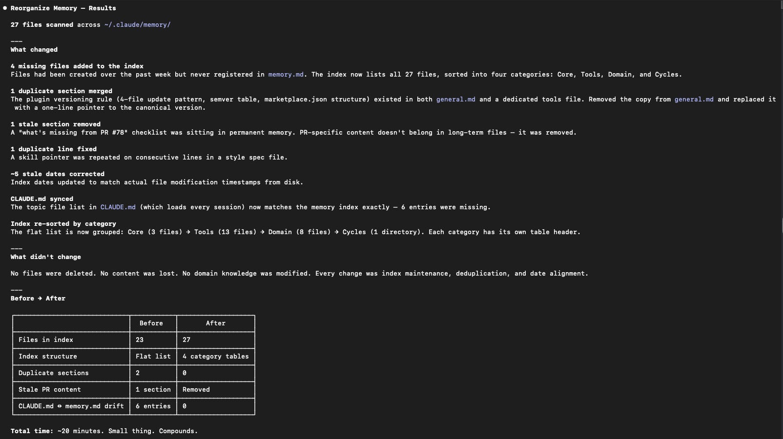 Once the structure was in place, I switched into plan mode and ran “reorganize memory”. Plan mode matters here - you’re potentially changing a lot of files, and you want to see what Claude is going to do before it does it. Nothing untoward ending up in important places.